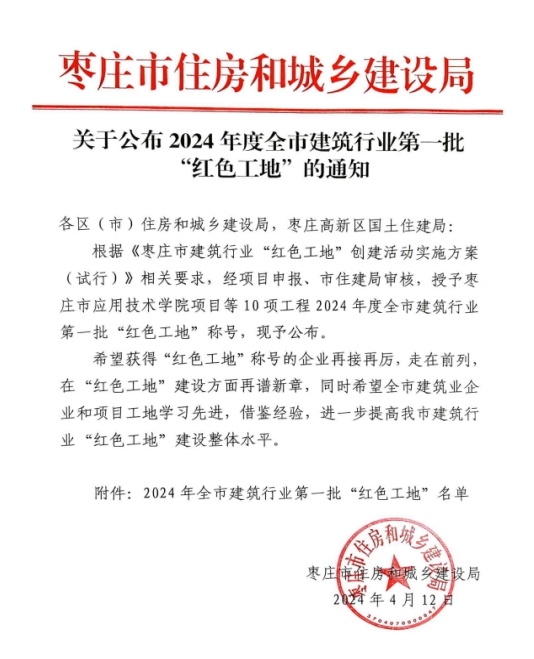 近日,棗莊市住房和城鄉(xiāng)建設局公布了2024年全市建筑行業(yè)第一批“紅色工地”名單,由公司承建的棗莊市嶧城區(qū)人民醫(yī)院改擴建工程建設項目榮獲2024年度棗莊市建筑行業(yè)第一批“紅色工地”稱號。