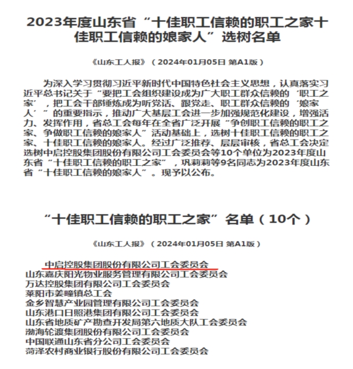 近日,山東省總工會(huì)在全省范圍內(nèi)開(kāi)展“爭(zhēng)創(chuàng)職工信賴(lài)的職工之家、爭(zhēng)做職工信賴(lài)的娘家人”選樹(shù)活動(dòng)。經(jīng)過(guò)廣泛推薦、網(wǎng)絡(luò)投票、現(xiàn)場(chǎng)考察等層層審核,全省共選樹(shù)10個(gè)單位為2023年度山東省“十佳職工信賴(lài)的職工之家”,中啟控股集團(tuán)股份有限公司工會(huì)委員會(huì)成功獲評(píng)此項(xiàng)榮譽(yù)。