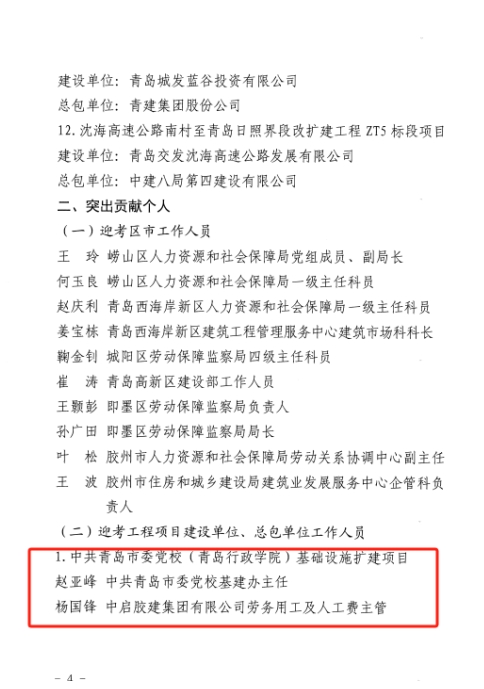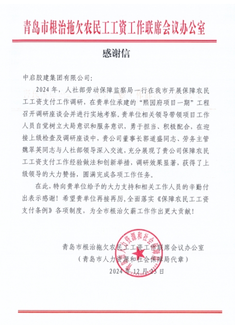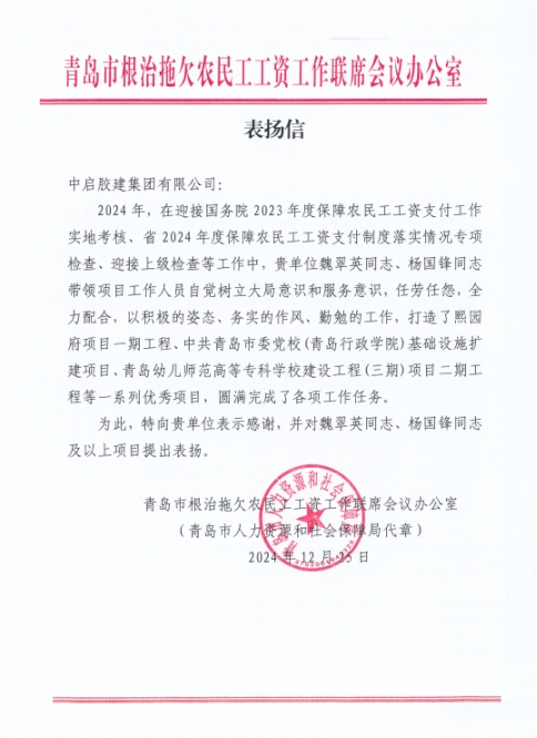 2024年,在公司領(lǐng)導(dǎo)的正確帶領(lǐng)下,在各單位各項(xiàng)目的大力支持和相關(guān)工作人員辛勤付出下,公司在保障農(nóng)民工工資支付工作方面先后圓滿完成了各項(xiàng)調(diào)研、檢查工作并取得了優(yōu)異成績。為表彰我公司在保障農(nóng)民工工資支付工作方面做出的突出貢獻(xiàn),青島市人社局、膠州市人社局分別向公司發(fā)來感謝信,對公司及在調(diào)研、檢查工作中做出突出貢獻(xiàn)的先進(jìn)項(xiàng)目和先進(jìn)個人魏翠英、楊國鋒進(jìn)行通報表揚(yáng)。
