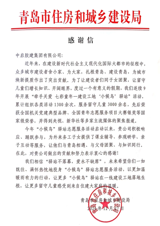 市住建局表示:“今年“小候鳥”驛站志愿服務(wù)活動(dòng)啟動(dòng)以來,貴公司積極響應(yīng)、踴躍參與,為外來務(wù)工子女提供了課業(yè)輔導(dǎo)、參觀研學(xué)、親子互動(dòng)等服務(wù),讓他們與青島相遇、與父母團(tuán)聚、與知識(shí)同行。在此,對(duì)貴公司做出的貢獻(xiàn)和努力表示衷心的感謝!”。
