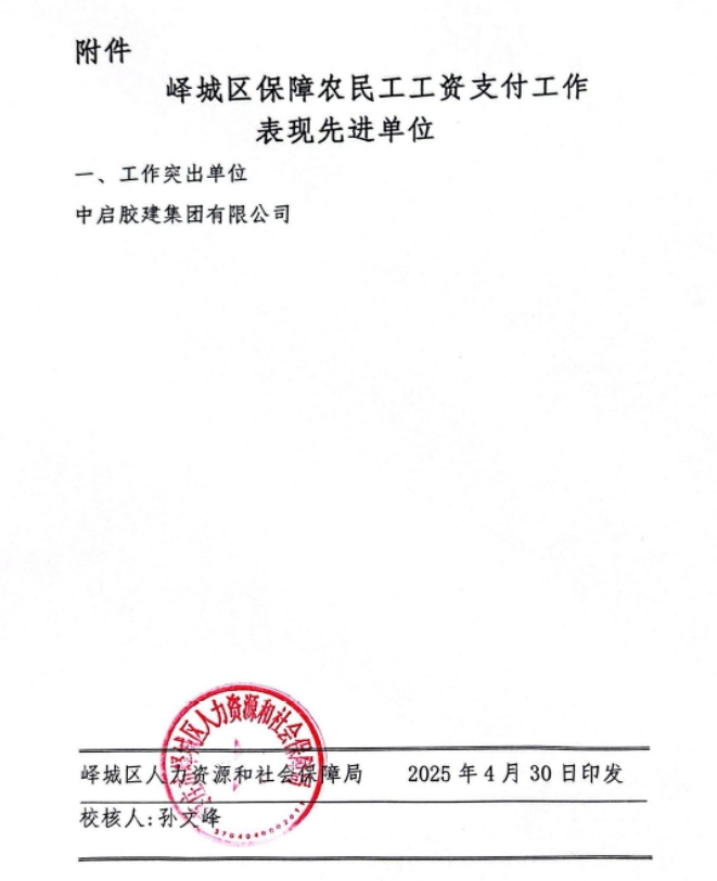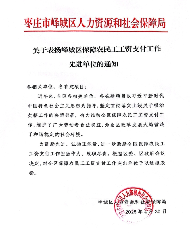 公司堅定貫徹落實上級關于根治欠薪工作的決策部署,由華東分公司承建的棗莊市嶧城區(qū)人民醫(yī)院項目在保障農民工工資支付工作中擔當作為,履職盡責。棗莊市嶧城區(qū)人力資源和社會保障局對公司進行了通報表揚,公司被評為嶧城區(qū)保障農民工工資支付工作先進單位。