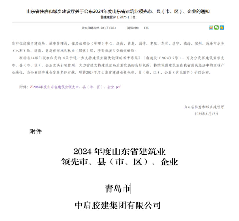近日,山東省住房和城鄉(xiāng)建設廳正式公布2024年度山東省建筑業(yè)領先市、縣(市、區(qū))、企業(yè)名單,中啟膠建集團有限公司憑借卓越的綜合實力、穩(wěn)健的經營表現和突出的行業(yè)貢獻,成功入選“2024年度山東省建筑業(yè)綜合實力領先企業(yè)”。這是繼獲評“齊魯建造”品牌后,公司本年度再度斬獲的省級重磅榮譽,標志著企業(yè)在高質量發(fā)展征程中邁上新臺階!