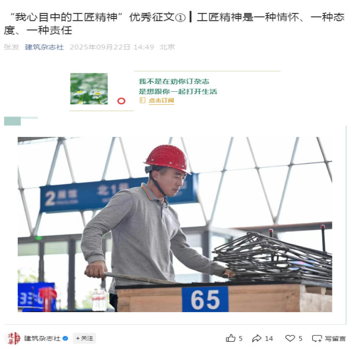 近日,《建筑雜志社》開展了“我心目中的工匠精神”征文活動(dòng),中啟膠建集團(tuán)膠州公司張發(fā)同志的《工匠精神是一種情懷、一種態(tài)度、一種責(zé)任》作為優(yōu)秀征文在《建筑雜志社》上刊發(fā),并在山東省住房和城鄉(xiāng)建設(shè)廳、山東省建設(shè)建材工會(huì)等公眾號(hào)上轉(zhuǎn)載宣傳。