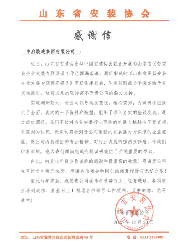 近日,集團(tuán)收到山東省安裝協(xié)會發(fā)來的感謝信,對我司在山東省民營安裝企業(yè)發(fā)展專題調(diào)研中的鼎力支持致以誠摯感謝與崇高敬意。