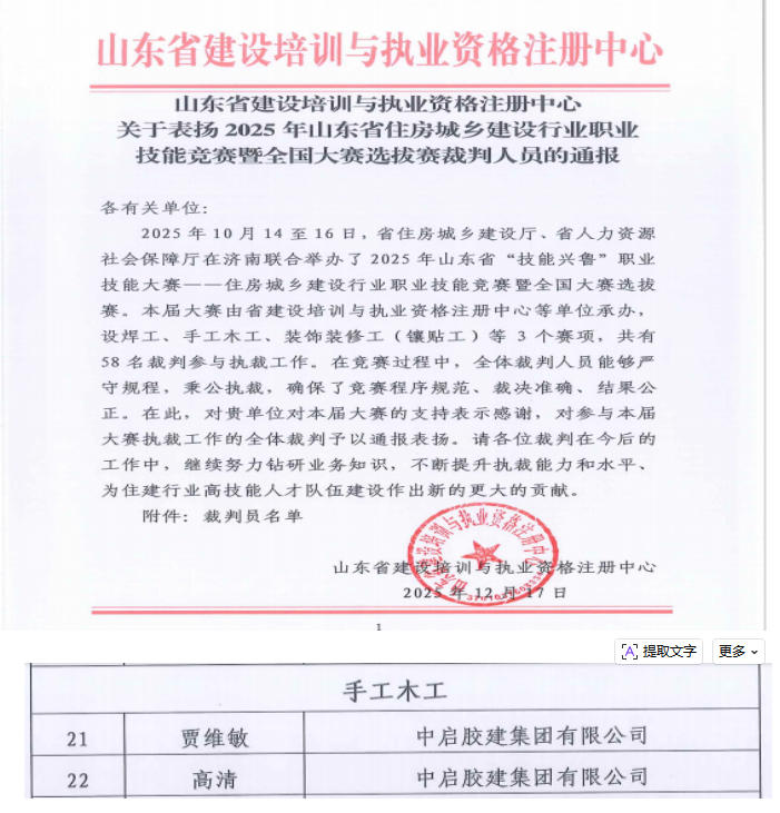 近日,山東省建設(shè)培訓(xùn)與執(zhí)業(yè)資格注冊中心發(fā)布通報,對參與2025年山東省“技能興魯”職業(yè)技能大賽——住房城鄉(xiāng)建設(shè)行業(yè)職業(yè)技能競賽暨全國大賽選拔賽的裁判人員予以通報表揚。集團職工賈維敏、高清名列其中,展現(xiàn)了集團職工精湛的專業(yè)素養(yǎng)和公正嚴謹?shù)膱?zhí)裁風(fēng)采。